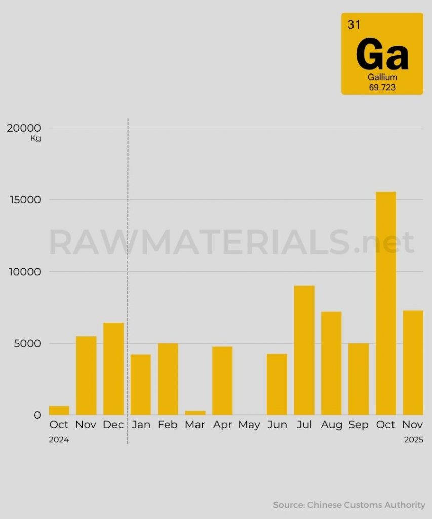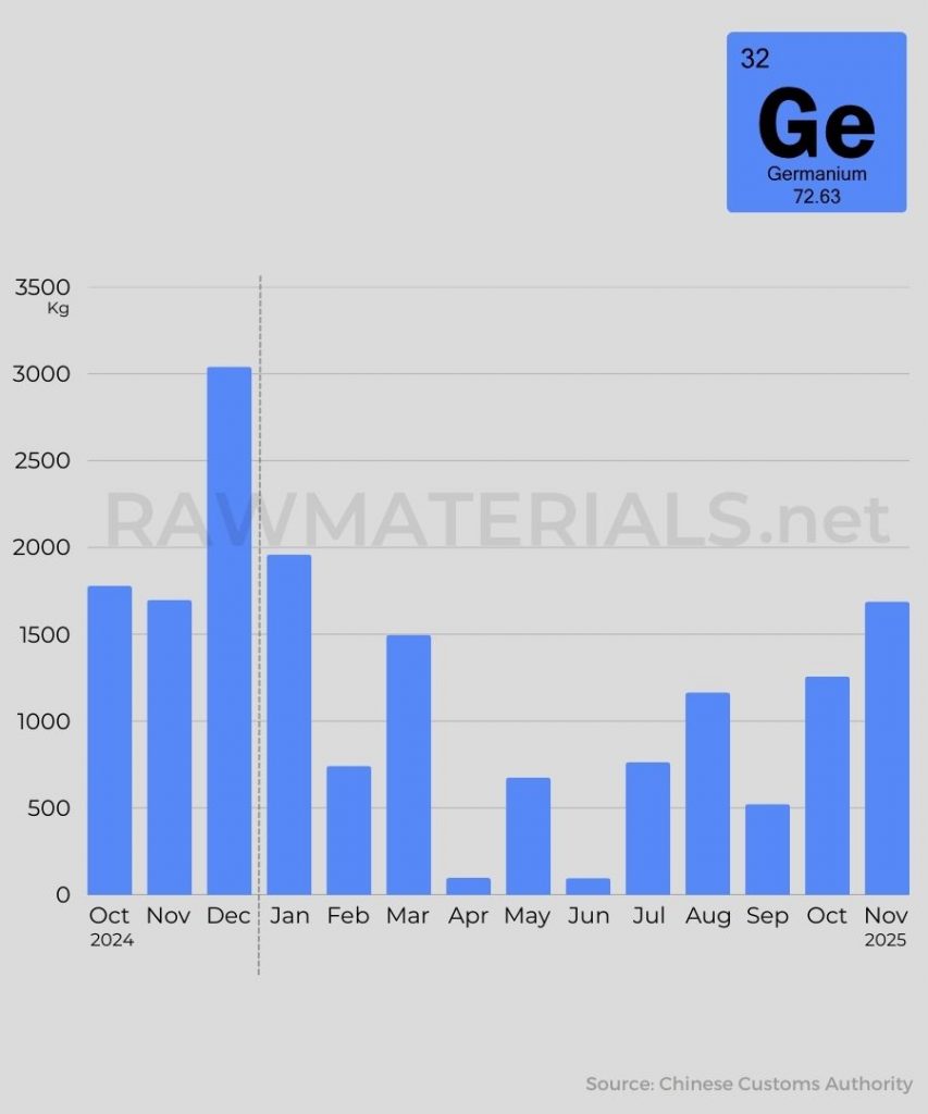 In contrast, China’s germanium exports have increased for the second consecutive month. Already in October, shipments more than doubled compared with September. In November, exports reached 1,688 kilograms, marking another 34 percent rise.